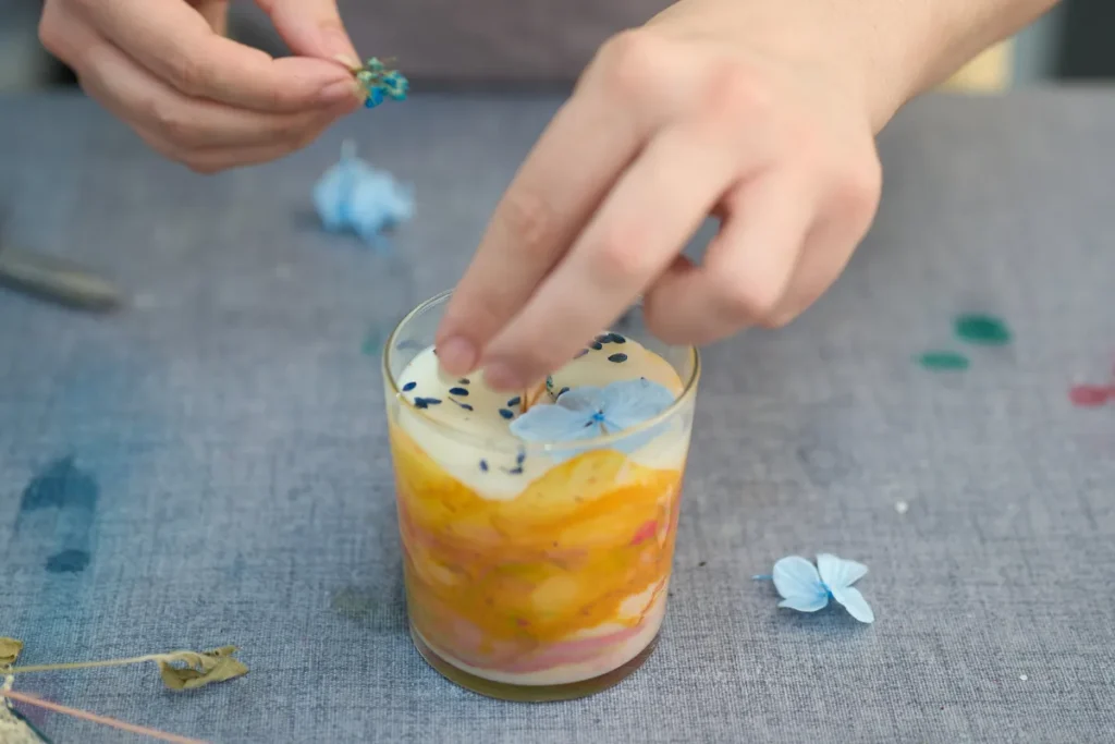 - Kuruduktan sonra mumunu süsleyebilirsin. Kurdeleler, minik figürler veya doğal dekorlar ile hediyelik mumunu daha özel hâle getirmek mümkün.