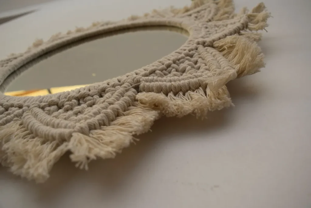 - Makrome Ayna Çerçevesi: Yuvarlak bir aynanın etrafına düğüm teknikleriyle ip geçir, kenarlarına püskül veya fringe ekle; evinin en dikkat çekici köşesi hazır!